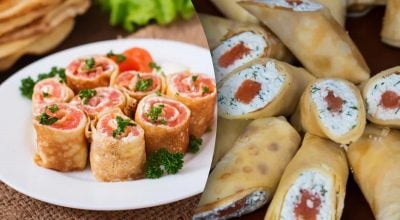 Krep soğuduktan sonra parşömeni çıkarın, üzerine krem peynir sürün, kırmızı balık dilimlerini yayın ve her şeyi yuvarlayın.