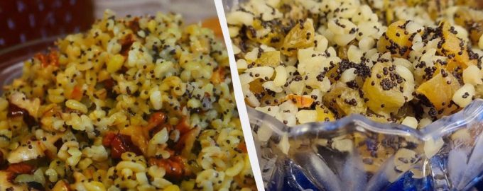 Mısır gevreğini birkaç kez durulayın, su ekleyin ve 15 dakika kısık ateşte pişirin. Bulguru üstü kapalı olarak soğumaya bırakın. Kuru üzüm ve haşhaş tohumlarının üzerine kaynar su dökün ve 30 dakika bekletin, fındıkları küçük parçalar halinde kesin. Haşhaş tohumlarını bir blender veya harçla öğütün. Daha sonra yulaf lapasını bal ve diğer malzemelerle karıştırın.